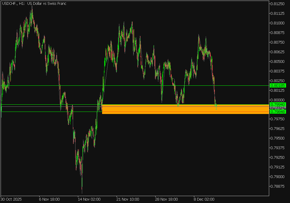 ضغط هابط قصير المدى مع وصول السعر إلى منطقة طلب ضيقة حول 0.7990–0.7985، بينما أول مقاومة فعلية قرب 0.8018 ثم 0.8065.