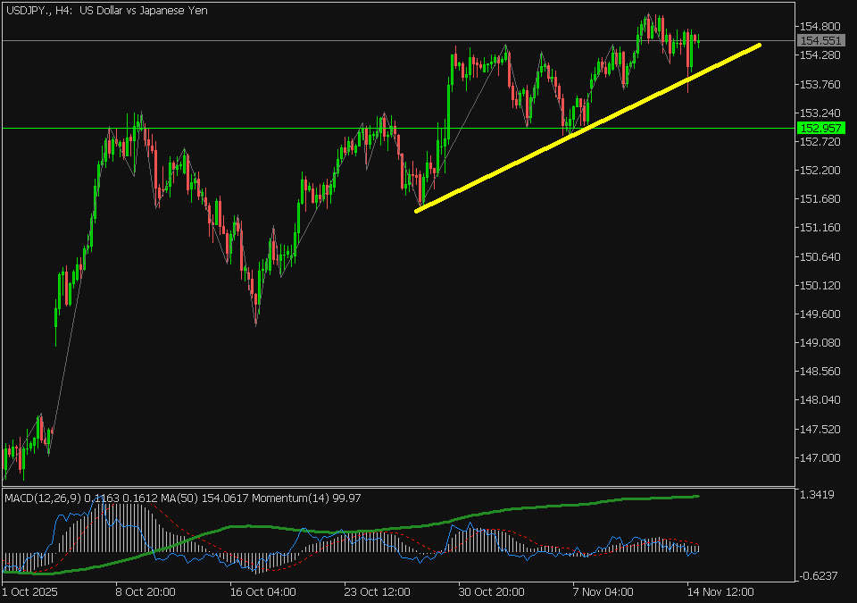 الاتجاه صاعد بثبات، مع قمم وقيعان مرتفعة. السعر يتحرك فوق خط اتجاه صاعد واضح، ويمتلك دعماً قوياً عند 153.20 ثم 152.96.