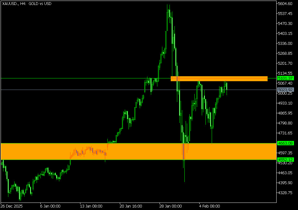 منطقة 5100 تمثل مقاومة واضحة، بينما تشكل المنطقة 4660–4550 نطاق طلب رئيسي.