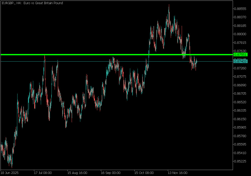 المنطقة بين 0.8755 و0.8780 أصبحت سقفًا للحركة، فيما يشكل المستوى 0.8720 محورًا لتوازن القوى. غياب الزخم الشرائي يؤكد أن المشترين لم يستعيدوا السيطرة بعد.