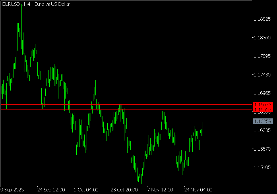 The pair remains under bearish pressure. Price is still below the nearby resistance band at 1.1655–1.1668, with a sequence of lower highs capping upside momentum.