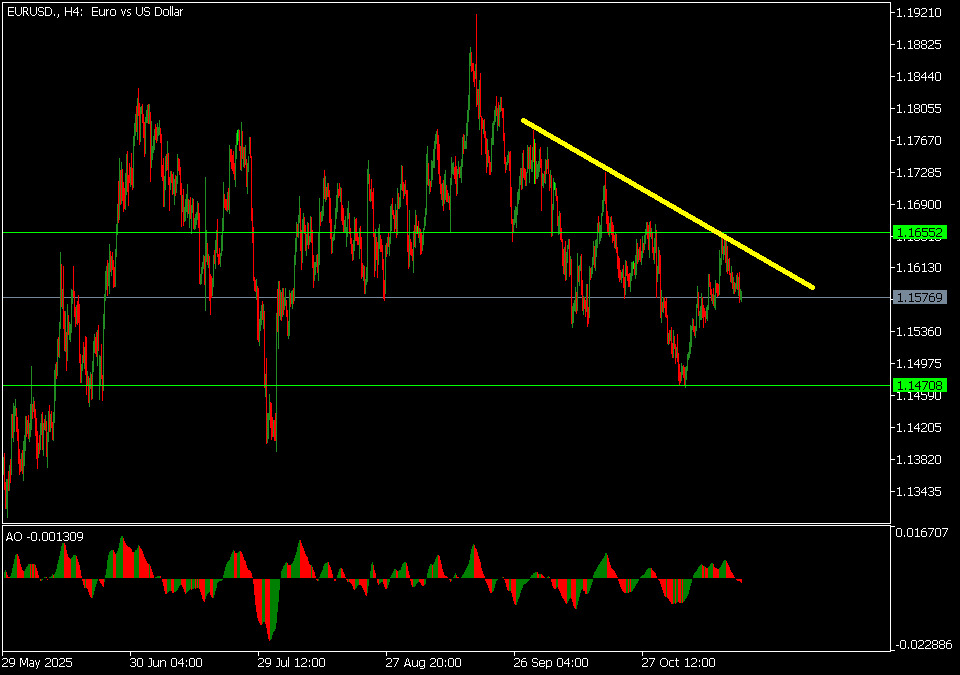 Medium‑term downtrend. The latest bounce is capped by a descending trendline and a key supply band around 1.1610–1.1655.