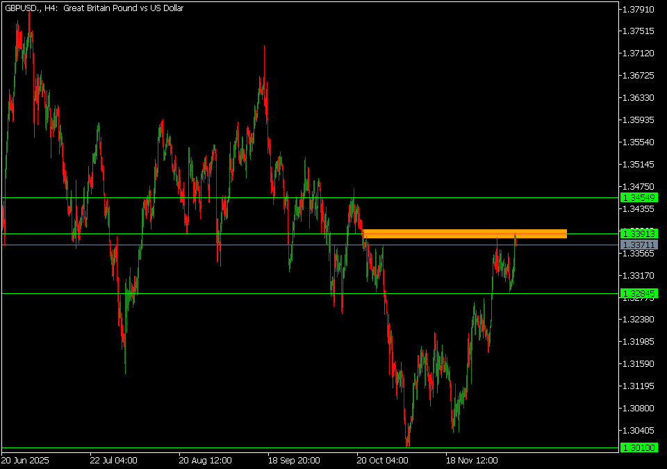 Short‑term bullish within a broader rotation. Price is approaching a supply band at 1.3391–1.3455; nearest support sits at 1.3285.