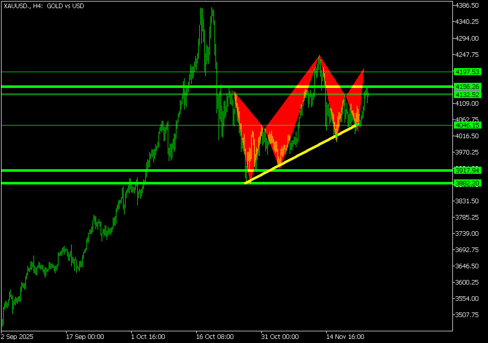 The broader uptrend remains dominant, supported by an ascending trendline from 3918. Price is testing resistances around 4132 and 4156, with a potential breakout setup forming.