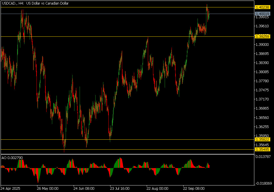 Short‑term uptrend in play; price cleared 1.39259 and tagged 1.40238, now consolidating around 1.40019. Holding above 1.39259 keeps buyers in control, while a drop back below could trigger broader profit‑taking.